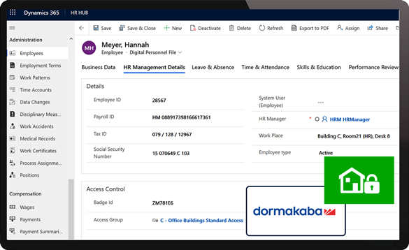 Zeiterfassung und Zutrittskontrolle in einer Lösung? Kein Problem! Mit den Integrationen zu Herstellern für Zeiterfassung und elektronische Zutrittskontrollem wie beispielsweise Dormakaba müssen Sie sich ab sofort nicht mehr um verschiedene Systeme kümmern. Sie finden alles in Ihrer vertrauten HR für Dynamics Lösung.