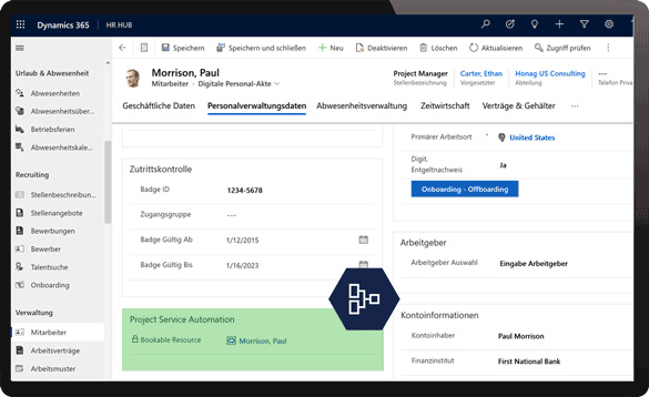Microsofts Project Service Automation App unterstützt Sie bei der effizienten Verfolgung, Verwaltung und Bereitstellung projektbasierter Services, vom ersten Verkauf bis hin zur Rechnungsstellung. Durch die Integration mit HR für Dynamics können alle Daten aus Ihrer HR Lösung per Knopfdruck in PSA übertragen und dort verwendet werden. Sie müssen sich nicht um eine doppelte Datenpflege kümmern. Das nimmt Komplexität und spart Ihnen eine Menge Zeit! Mehr erfahren.