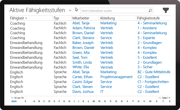 - Weitere Filterung nach Fähigkeitstyp, Fähigkeitsstufe, Abteilung etc. möglich