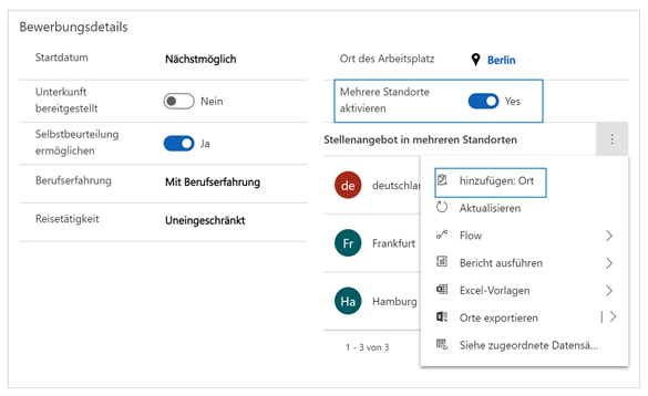 In Rollup Update 36 haben wir diverse Verbesserungen für das Recruiting Portal geschaffen, damit Sie Ihre Stellenangebote noch personalisierter auf Ihrer Webseite gestalten können. Diese Erweiterung ermöglicht es Ihnen, individuelle Anpassungen Ihrer Stellenanzeigen vorzunehmen. Nun können Sie für Ihre Zielgruppen unterschiedliche Stellenanzeigen-Designs anlegen und damit unterschiedliche Emotionen hervorrufen. Außerdem werden automatisch die Kontaktinformationen des Recruiters in den Stellenangeboten angezeigt, damit potentielle Bewerber den richtigen Ansprechpartner schnell finden. Sie sparen sich Zeit, da mithilfe weniger Klicks bei jeder Stellenanzeige einheitliche Kontaktinformationen ausgespielt werden können. Die Funktion, Arbeitsorte innerhalb der Stellenanzeige mitzugeben, gab es schon. Jetzt ist es aber möglich mehrere Arbeitsorte innerhalb einer Stellenanzeige anzulegen. Dies hat den Vorteil, dass Sie für mehrere Arbeitsorte nur eine Stellenanzeige erstellen und pflegen müssen und Sie den Kandidaten mehrere Optionen für den perspektivischen Arbeitsort einfach zur Verfügung stellen.