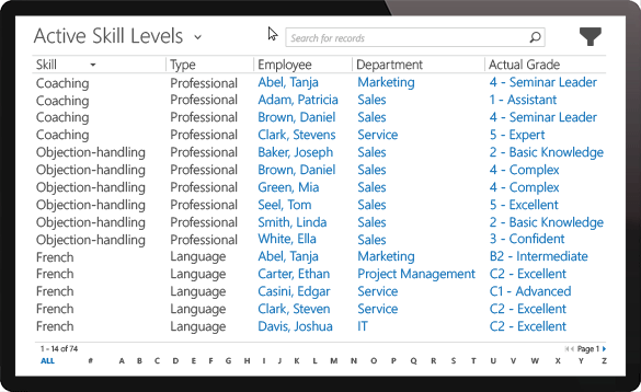 Are you internally looking for an internal employee who has a very specific skill set? Reduce your search to a few clicks. In the skills overview, you have the possibility to search directly for the desired skill via a search field.
