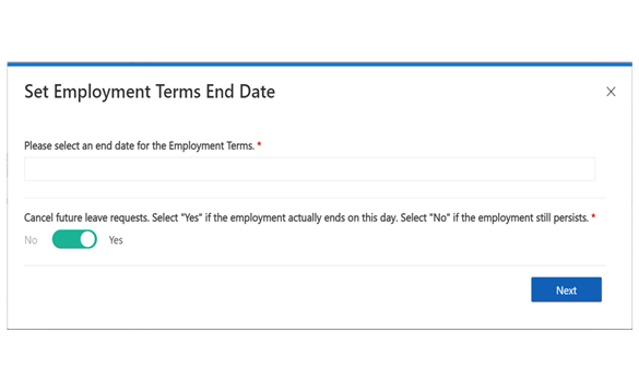 Upon termination of employment, the user has the option to cancel or not all future leave request. This significantly shortens the process as this decision can now be made within one form. Furthermore, potential errors are reduced and the post-processing time is shortened.