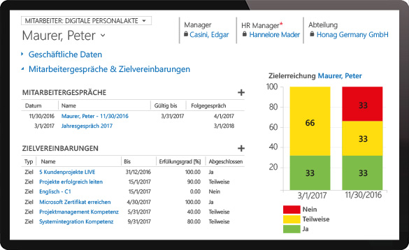 Dynamics Talent Management supports you with the organization and implementation of performance reviews. Goals agreed upon are automatically added to the digital personnel file.