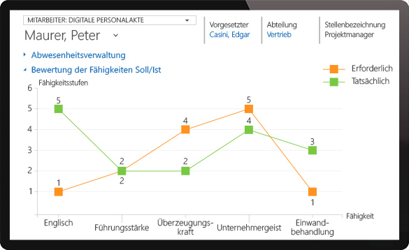 With the assistance of Dynamics Talent Management, you keep a close eye on the skills of your employees and can immediately address possible deficits. Set requisite skills and skill level for each employee. All required and actual skills are shown in a chart, directly in the digital personnel file.
